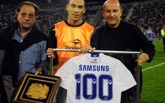 Iván Bella recibe una plaqueta por sus 100 partidos en Vélez / FotoBaires